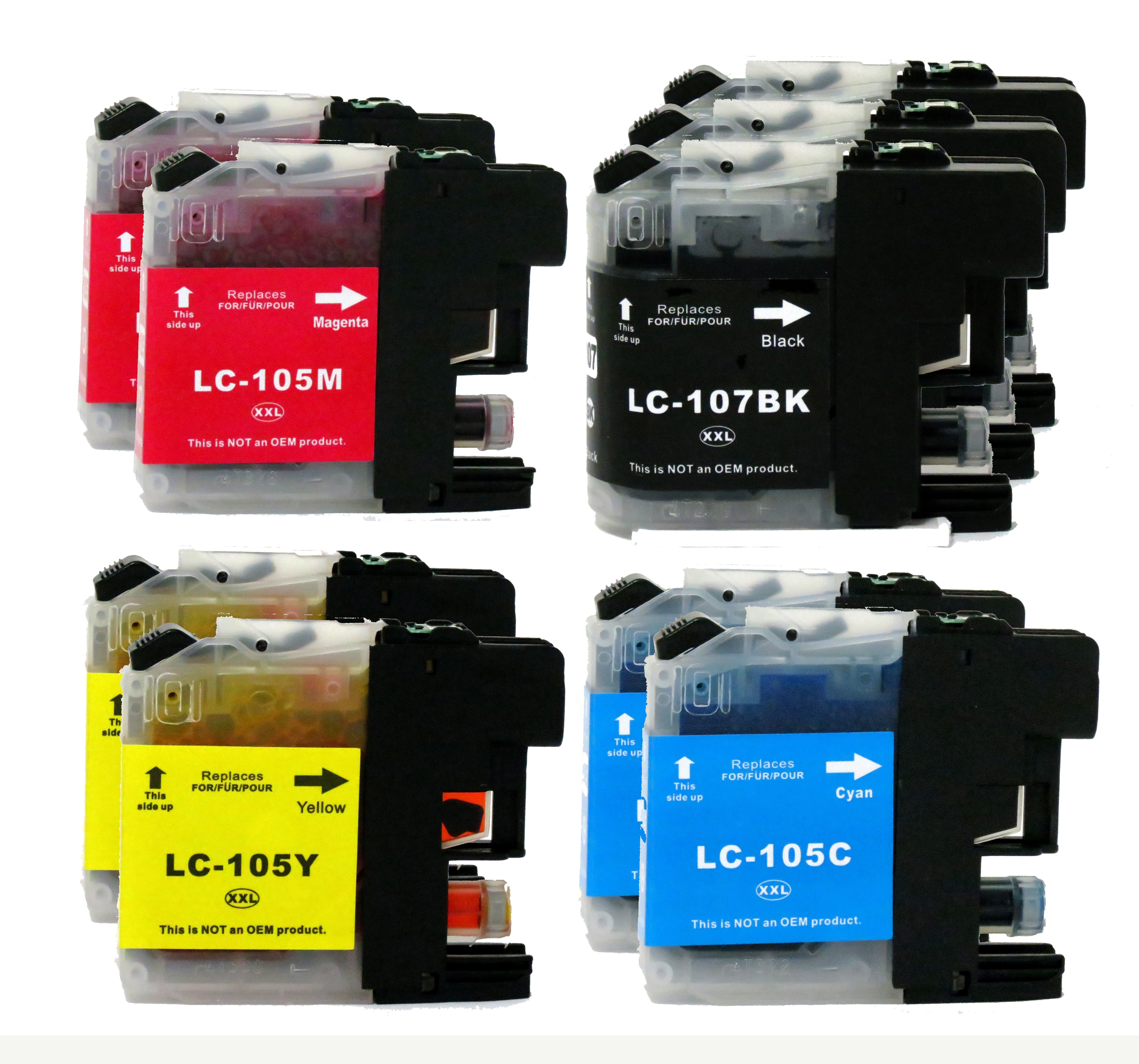 Our Compatible Brother LC107BK, LC105C, LC105M, LC105Y high yield ink cartridges (3 black, 2 cyan, 2 magenta, 2 yellow) value pack is designed to meet or exceed the specifications of the OEM (original equipment manufacturer) cartridge while offering consumers with cost savings of up to 80%. Our Brother LC107BK, LC105C, LC105M, LC105Y high yield ink cartridges are produced with new components by our carefully sourced third-party suppliers. Inkjet Star backs up our products with 100% satisfaction guarantee.