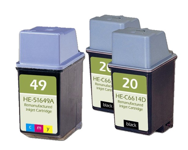Our Remanufactured HP ink cartridges - C6614A (No. 20) black ink cartridge (2 pieces) and 51649 (No. 49) color ink cartridge (1 piece) is designed to meet or exceed the specifications of the OEM (original equipment manufacturer) cartridge while offering consumers with cost savings of up to 80%. Our HP ink cartridges - C6614A (No. 20) black ink cartridge (2 pieces) and 51649 (No. 49) color ink cartridge (1 piece) is produced with new components by our carefully sourced third-party suppliers. Inkjet Star backs up our products with 100% satisfaction guarantee.